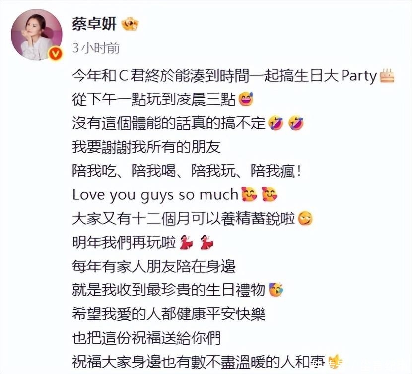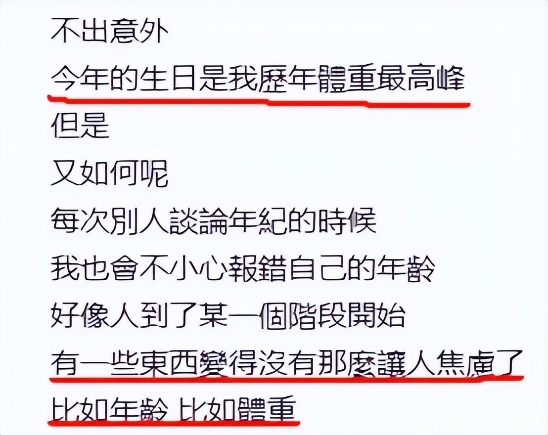 蔡卓妍还在长文中坦言今年是“历年体重最高峰”,但已不再焦虑年龄与体重,更重视健康与当下幸福。