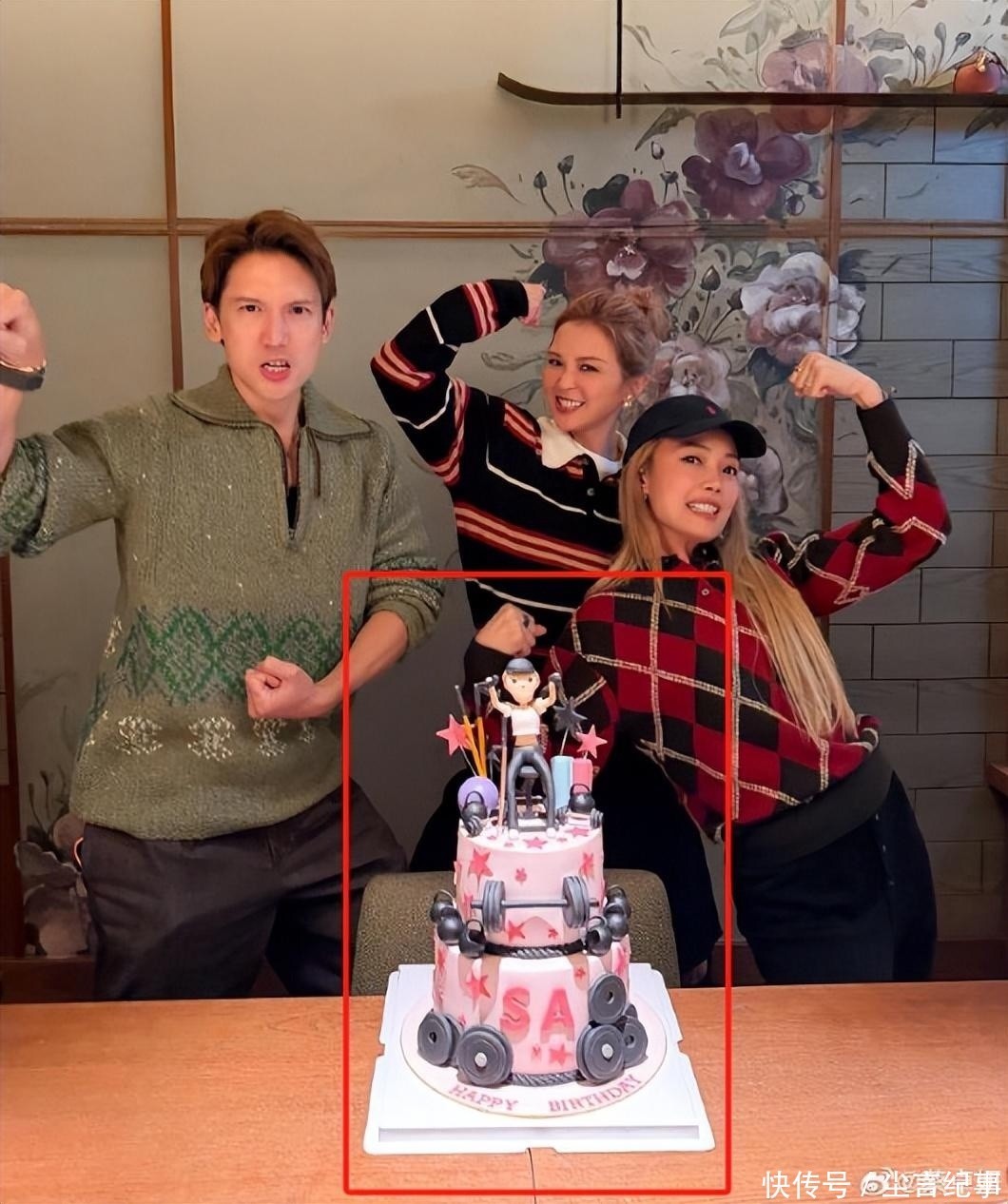 容祖儿、关智斌还定制了“健身主题”多层蛋糕,装饰阿Sa健身造型的Q版公仔,呼应她近年热衷运动的生活状态。